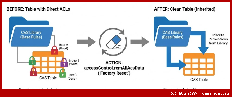 Explanation : This example deepens the understanding of permission inheritance. A table is created and its initial permissions (inherited from the caslib) are displayed. Then, a direct permission is added to the table. `remAllAcsData` is used to remove this direct permission, demonstrating how inherited access becomes predominant again. The goal is to clearly show the impact of the reset on the permission cascade.