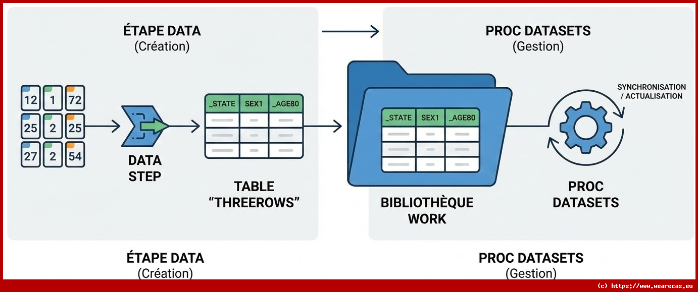 Dans votre première étape DATA, la ligne INFILE CARDS est redondante. L instruction CARDS indique déjà à SAS de lire les données intégrées au script. De plus, la procédure DATASETS étant interactive, elle se termine à l instruction QUIT. Le RUN situé juste après est donc ignoré par le système. Vous pouvez retirer ces deux lignes pour un code plus propre et direct.